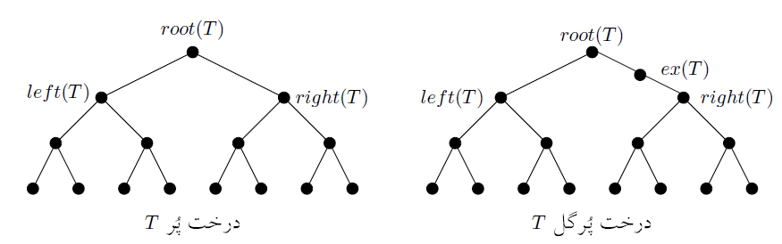 درخت پُرِ$ T$ گرافی است با $2^n - 1$ رأس کهیک رأس آن ریشه است که$ root(T)$ خوانده میشود.$ root(T)$ دو رأس مجاور دارد به نامهای $left(T)$ و $right(T)$ که هر کدام ریشهی درخت پُری با $2^{n-1}-1$ رأس هستند. اگر یک رأس بین ریشه و یکی از دو فرزند درخت پُرِ $T$ اضافه کنیم، درختی با $2^n$ رأس به دست میآید که آن را «پُر گل» و رأس اضافه را $ex(T)$ مینامیم. شکل زیر یک درخت پر با ۱۵ رأس و یک درخت پر گل با ۱۶ رأس را نشان میدهد.