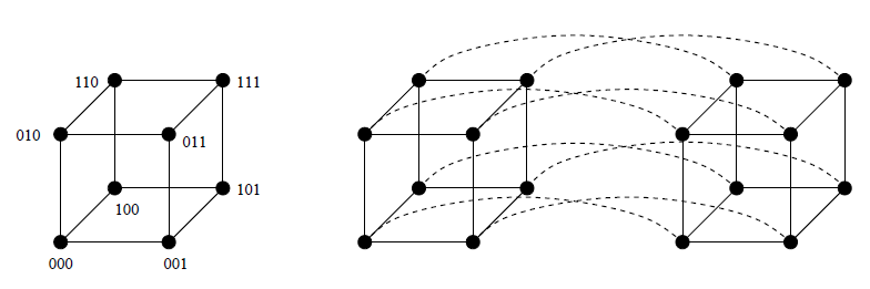 فوق مکعب از درجهی $n$ هم گرافی است با $2^n$ راس، که اگر هر راس آن را با یک عدد $n$ رقمی متمایز در مبنای ۲ نشان دهیم، هر رأس $a_1 a_2 … a_n$ (که $a_i$ یا صفر است و یا ۱) به $n$ رأس دیگر وصل است. دو رأس به هم متصلاند اگر نمایش دودویی آن دو دقیقاً در یک رقم اختلاف داشته باشد. میتوان دید که اگر دو فوق مکعب از درجهی $n$ را بگیریم و بین هر دو رأس از هر دو فوق مکعب با نمایش بیتی یکسان یک یال اضافه کنیم، یک فوق مکعب از درجهی $n+1$ به دست میآید. شکل زیر یک فوق مکعب از درجهی ۳ و فوق مکعب درجهی ۴ را نشان میدهد.