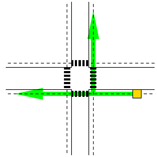 مردم پیاده فقط مستقیم بر روی پیادهرو حرکت میکنند مگر هنگامی که به چهارراه برسند٬ که در آن صورت دقیقاً از خطکشی عابر پیادهی یکی از خیابانهای آن چهارراه عبور میکنند و در همان جهت عبور به راه خود ادامه میدهند.