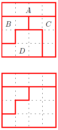 یک جدول $n \times n$ در اختیار داریم. در ابتدا جدول از $n^2$ ناحیه تشکیل شده است ($n^2$ مربع $۱ \times ۱$). در هر مرحله میتوانیم تمام دو ناحیهی مجاور (یعنی دو ناحیه که لااقل یک پارهخط مشترک دارند) را از جدول انتخاب کنیم و این دو ناحیه را با هم ادغام کنیم؛ یعنی مرز مشترک بین این دو ناحیه را پاک کنیم. فرض کنید طول این مرز مشترک در مرحلهی $i$ام $a_i$ باشد. اگر بعد از $k$ مرحله٬ تنها یک ناحیه باقی بماند (یعنی یک مربع $n \times n$٬ اعداد $a_۱,…,a_k$ به دست میآیند. برای مثال٬ در شکل سمت چپ بالا اگر نواحی $D$ و $C$ را بخواهیم با هم ادغام کنیم٬ محیط مشترک بین این دو ناحیه ۳ واحد بوده و نهایتاً به شکل پایین میرسیم.