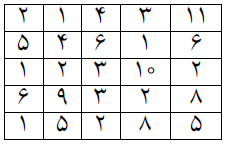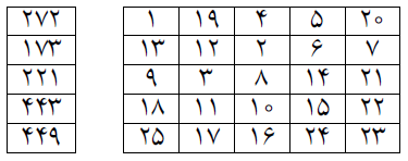 میخواهیم در یک جدول $۵ \times ۵$ دیگر به اسم $B$ ، مقادیر ۱ تا ۲۵ را، هرکدام دقیقاً یکبار، به گونهای قرار دهیم که مقدار $S$ کمینه شود. مقدار $S$ بهصورت زیر به دست میآید: