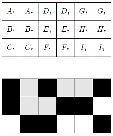 جدول مقابل شامل ۹ خانهی زوج میباشد که با حروف مشابه (به عنوان مثال $A_1$ و $A_2$) مشخص شدهاند. از هر زوج خانه دقیقا یکی را سیاه میکنیم تا در پایان ۹ خانه از ۱۸ خانه سیاه باشند.