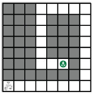 جدول زیر را در نظر بگیرید. خانه‌های خاکستری غیر مجاز هستند. طول کوتاه‌ترین برنامه‌ای که ربات با اجرای آن حداقل یک بار به خانه‌ی هدف (انتهای مسیر سفید) می‌رسد٬ چند است؟