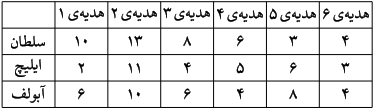 سلطان، ایلیچ و آبولف سه برادر هستند. پدر آنها شش هدیه برای آنها خریده است. هر کدام از بچهها به ازای هر هدیه گفتند به چه میزانی با گرفتن آن هدیه خوشحال میشوند. این مقادیر در جدول زیر آمده است: