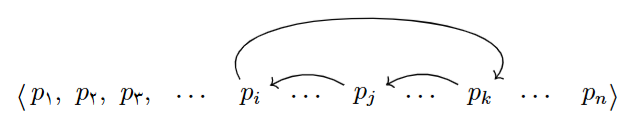 او در هر حرکت، می‌تواند مانند شکل زیر، سه جایگاهِ $ (i,j,k) $ را با شرطِ $\leq i < j < k \leq n$ در جایگشت خود انتخاب کند و اعدادِ این سه جایگاه را در آن، دَوَران دهد؛ یعنی عدد جایگاهِ $j$اُم را به جایگاهِ $i$اُم ببرد، عدد جایگاهِ $k$اُم را به جایگاهِ $j$اُم ببرد، و عدد جایگاهِ $i$اُم را به جایگاهِ $k$اُم ببرد.