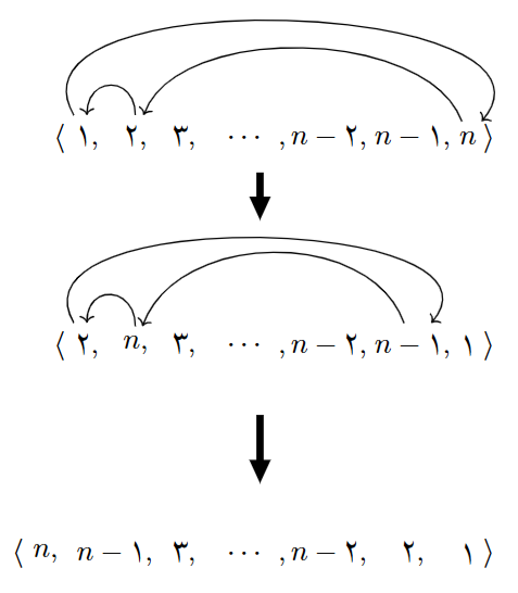 گام: اگر فرض کنیم این کار برای $n$ ممکن است، ثابت می‌کنیم اینکار برای $n+4$ نیز ممکن است. ابتدا جای $1$ را با $n$ و جای $2$ را با $n-1$ تغییر می‌دهیم. این کار را مطابق شکل زیر انجام می‌دهیم.