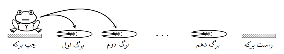 - قورباغه دهم با پرش از روی برگ $1$ به سمت راست برکه میرسد.