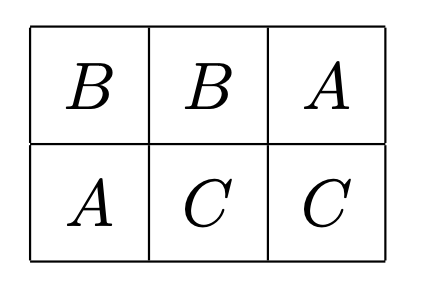 جدولی ۳ × ۲ داریم که در آن سه جفت $A, B, C$ وجود دارند. فاصلهی منهتنی دو خانهی $(x, y)$ و $(x', y')$ برابر با $|x-x'| + |y-y'|$ است؛ برای مثال در جدول زیر اگر مختصات هر خانه از جدول را برابر با شمارهی سطر و ستون آن در نظر بگیریم، جمع فواصل منهتنی این سه جفت برابر با $3+1+1=5$ میشود. به ازای تمام حالات چینش این سه جفت در جدول، امید ریاضی جمع فواصل منهتنی این جفتها چهقدر است؟