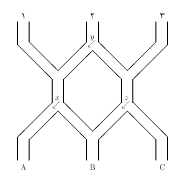 در هر یک از ورودی‌های ۱، ۲ و ۳ می‌توانیم یک گلوله بیندازیم. این گلوله به‌سوی پایین حرکت می‌کند و با توجه به وضعیت کلیدهای $x$، $y$ و $z$ از یکی از خروجی‌های $A$، $B$ یا $C$ خارج می‌شود. کلیدهای $x$، $y$ و $z$ به این صورت عمل می‌کنند: هر کلید می‌تواند در یکی از دو وضعیت $\searrow$ یا $\swarrow$ باشد. اگر کلید در وضعیت $\searrow$ باشد، گلوله را به سمت راست و اگر در وضعیت $\swarrow$ باشد، گلوله را به سمت چپ می‌فرستد. علاوه بر این با عبور هر گلوله از یک کلید، وضعیت آن کلید تغییر می‌کند.