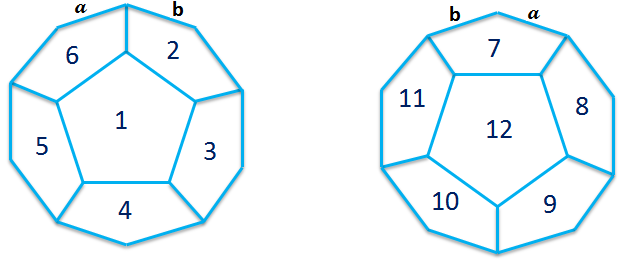 توجه کنید که این دو نصفه‌ی شکل به هم چسبیده‌اند، طوری که وجه‌های همسایه‌ی ۷ وجوه ۲، ۱۱، ۱۲، ۸ و ۶ هستند و در واقع دو نصفه از روی یال‌های $a$ و $b$ به‌هم چسبیده‌اند.