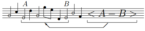 کلمههای اول، سوم و پنجم به ترتیب کارکترهای ‘<’ و ‘−’ و ‘>’ هستند. کلمهی دوم $(a)$، ابتدا و کلمهی چهارم $(b)$، انتهای بازهای از نتها است که این ارجاع به آن اشاره میکند $(a\leq b)$.