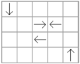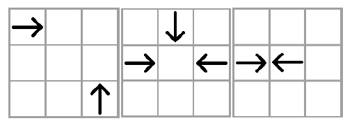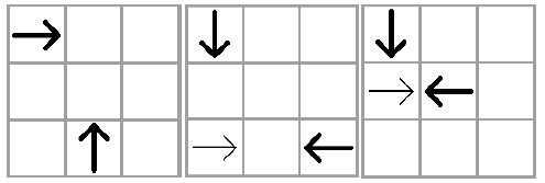 در شکل‌های زیر، پیکان‌ها نمایش‌گر کونای‌ها هستند. جهت هر پیکان جهت کونای متناظرش را نشان می‌دهد. در این شکل‌ها، همه‌ی پیکان‌های پررنگ دچار برخورد می‌شوند. از طرف دیگر، در هر یک از شکل‌های زیر، یک پیکان پررنگ هست که با پیکان پررنگ دیگر برخورد نمی‌کند. در شکل دوم و سوم، یک پیکان کم‌رنگ با یک پیکان پررنگ برخورد می‌کند. چون پیکان‌های برخوردکرده ناپدید می‌شوند، یک پیکان پررنگ هست که با پیکان پررنگ دیگر برخورد نمی‌کند. تعداد خانه‌هایی از جدول $W\times H$ را بشمارید که پس از گذشت مقدار کافی از زمان، کونایی از آن‌ها گذر می‌کند.