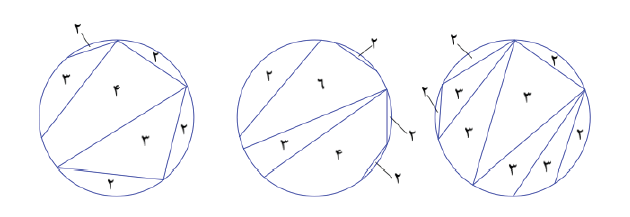 در یک قفس دایره شکل به شعاع $R$، $n$ خرس خوابیدهاند. رئیس باغوحش قصد دارد یک سری دیوار در این قفس بسازد تا خرسها به دستههای حداکثر $k$ تایی دسته بندی شوند. زیرا اگر در هنگام بیدار شدن آنها، بیش از $k$ تا خرس در یک اتاق باشند، با هم دعوا میکنند. دورتادور قفس دقیقاً $360$ تا میله با فواصل مساوی چیده شده است . میلهی صفرم روی نقطهی $(R,0)$ و مرکز قفس هم در $(0,0)$ میباشد. شمارهی میلهها از $0$ تا $359$ است و درجهت پادساعت گرد افزایش مییابد. به عبارت دیگر میلهی $i$ام در امتداد $i$ درجه از مرکز (نسبت به میلهی صفرم) قرار دارد. تمام دیوارها باید بین دو میله به صورت خطی مستقیم کشیده شوند و تضمین شده که نمیتوان دیواری کشید که از روی یک خرس عبور کند (هیچ خرسی روی خط واصل بین دو میله قرار ندارد). از طرفی دیوارها نباید در هیچ نقطهای به جز در نقاط انتهایی اشتراک داشته باشند و نباید یکدیگر را قطع کنند. رئیس باغوحش یک شرط دیگر هم میگذارد و آن این است که هیچ یک از اتاقهای پدید آمده، بیش از سه گوشه نداشته باشد (چه خرسی در آن اتاق باشد و چه نباشد). برای نمونه به شکلهای زیر توجه کنید: