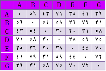 فاصلهی بین شهرها در تمام ورودیها یکسان است. این فاصلهها در جدول شکل زیر نشان داده شدهاند و در فایل DISTANCE.TXT در دسترس شما قرار خواهند گرفت.