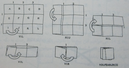- در شکل بالا در موقعیت اولیه، تا کردنهای ممکن عبارتاند از $H2U،H1L،H1U،V3R،V3L،V2R،V2L،V1R،V1L$ و $H2L$.