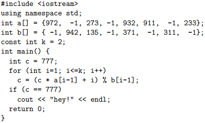 او میخواهد طوری مقادیر 1- را در سطرهای سوم و چهارم (تعریف آرایههای a و b) با اعداد سه رقمی (بزرگتر از ۹۹ و کوچکتر از $1000$) جایگزین کند که در سطر یازدهم (سطر $cout$) رشتهی $hey!$ چاپ شود.