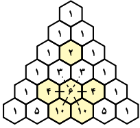 شکل زیر $6$ سطر اول مثلث خیام-پاسکال را نشان میدهد. راسهای گراف $G(6)$ در این شکل، با پسزمینهی رنگی مشخص شدهاند. یالهای متصل به راس $\binom{4}{2}$ نیز در گراف مشخص شدهاند. یالهایی که در گراف $G(6)$ هستند، با خط ممتد و یالهای خارج از آن، با خطچین نمایش داده شدهاند.