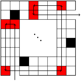 آزمون گواهینامهی کشور پیچپیچ در یک جدول $50 \times 50$ انجام میشود. در برخی از خانههای این جدول، موانعی قرار داده شده است. یکی از ضلعهای محیطی جدول برای ورود شرکتکننده و یکی دیگر از ضلعهای محیطی برای خروج او در نظر گرفته شده است. روی سایر ضلعهای محیطی حصار کشیده شده است. اگر شرکت کننده بتواند از ضلع ورودی وارد جدول شده و بدون برخورد به موانع از ضلع خروجی خارج شود، آزمون را با موفقیت پشت سر میگذارد. به انتخاب ضلع ورودی، ضلع خروجی و محل موانع چینش آزمون گفته میشود.